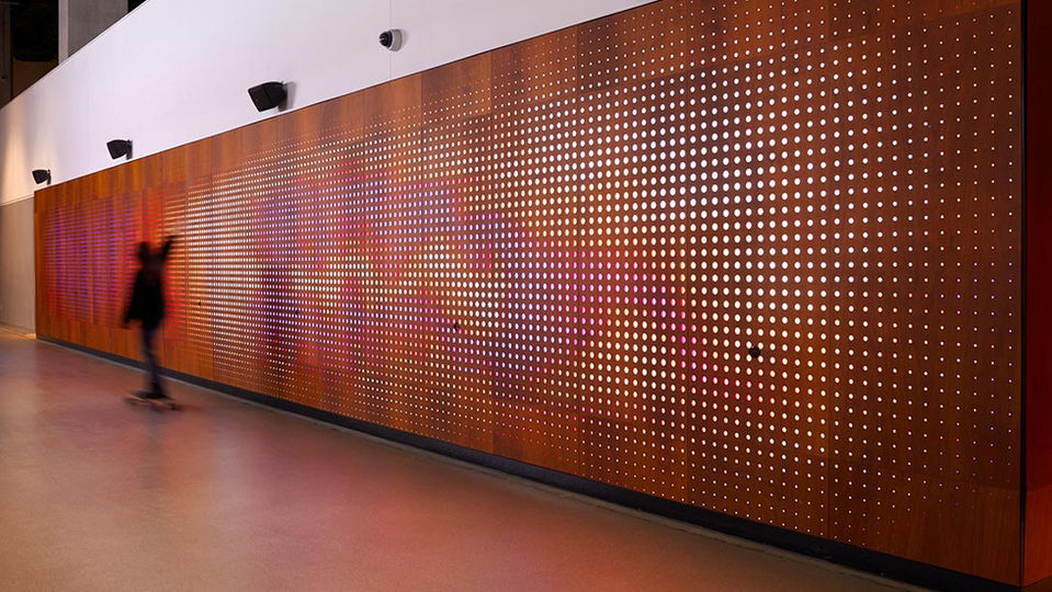 An homage to Dell’s cutting-edge server technology, ‘Pixel Wall’ brings this 70 ft of stadium corridor space to life by inviting sports fans, concert-goers & arena attendees to make infuse their energy into this one-of-a-kind living mural.